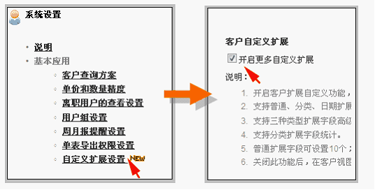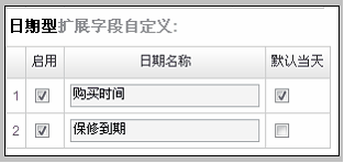 注意:数据字典中,自定义扩展下客户-扩展分类1到客户-扩展分类6,分别与分类型扩展自定义中1到6相对应。 日期型扩展字段设置: