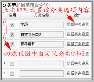 1和2为原客户视图中自定义分类1和自定义分类2。默认名称仍为自定义分类1和自定义分2这里支持名称自定义,如上图,我们将原“自定义分类1”改为“学历”。 启用的分类需设置选项内容,可直接点击分类中“数据字典设置”,也可到->账户->数据字典->自定义扩展中设置。如下图所示: