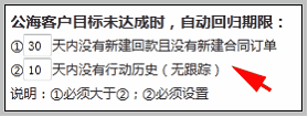 注: 1.订单回款的回归天数必须大于行动历史回归天数。 2.①和②可选其中一个设置,也可以两个都设置。如果两个都设置了,那么当②不满足的情况下,公海客户就会自动回归到客户公海。 3.当选择了①或②时,满足其中一个条件后,公海客户列表中的公海目标就会变为达成。 当①和②均选择时,只有满足①后,公海客户列表中的公海目标就会变为达成。 |