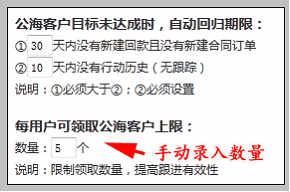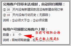 可在此对可领取公海客户数量上限做调整。当可领取公海客户数上限调小时,如:从5调整到3。若系统中公海用户已领取公海客户数量大于或等于5则设置不成功,将自动将最大可领取公海客户数量调整为当前公海用户已领取的最大公海客户数量。 如下图: